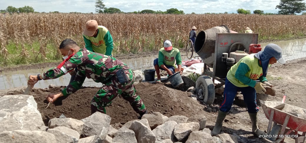 Klaten - Dalam rangka mewujudkan Kemanunggalan TNI dan Rakyat di tengah pandemi Covid-19 Babinsa Koramil 23/Ceper Kodim 0723/Klaten tetap lakukan karya bakti bersama warga, kali ini anggota Koramil 23/Ceper bersama warga bergotong-royong membangunan Talud.