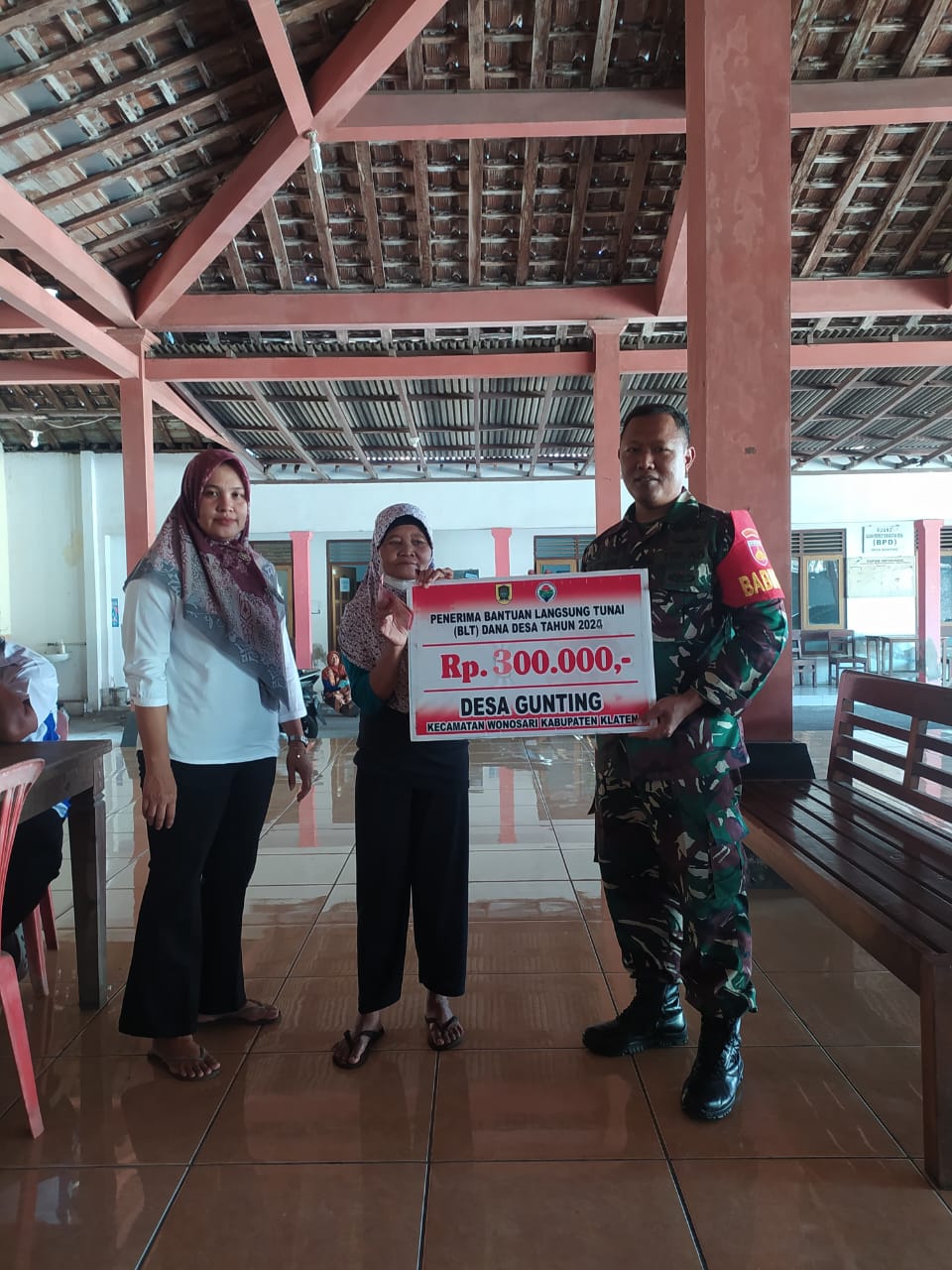 Klaten - Koptu Suherman, Babinsa Desa Gunting dari Koramil 22 Wonosari Kodim 0723 Klaten melaksanakan monitoring dan pendampingan penyaluran Bantuan Langsung Tunai Dana Desa (BLTDD) Tahap VI Tahun 2024 di Balai Desa Gunting Kecamatan Wonosari Kabupaten Klaten. (27/6/2024)