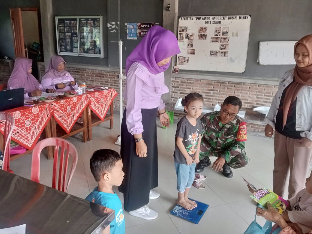 Serka Hermansyah Babinsa Suruh anggota Koramil 02/Tasikmadu melaksanakan pendampingan Ibu Eni Bidan desa melaksanakan Posyandu bertempat di balai dusun Dagen desa Suruh, kecamatan Tasikmadu, kabupaten Karanganyar.